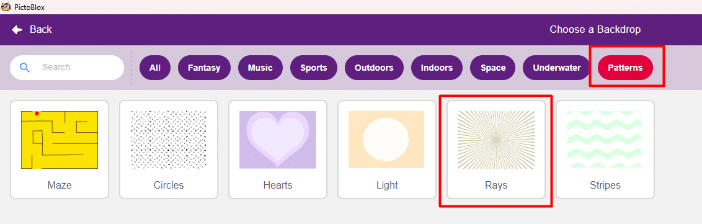 - We will now, click on the ‘Choose a backdrop’ option and select the Patterns category and select the Rays as the backdrop as shown.
