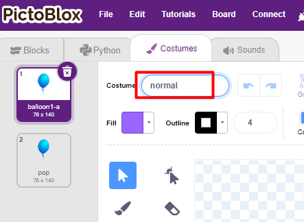 - Let us rename the balloon1-a costume as normal and balloon1-a2 costume as pop.
