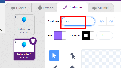 - Let us change the color of the Balloon2 sprite by clicking on the Costumes tab on the left side of the screen and select the color in the Fill option and fill the color in the Balloon2 sprite by using Fill tool. Note: Change the color for both the normal and pop costumes.