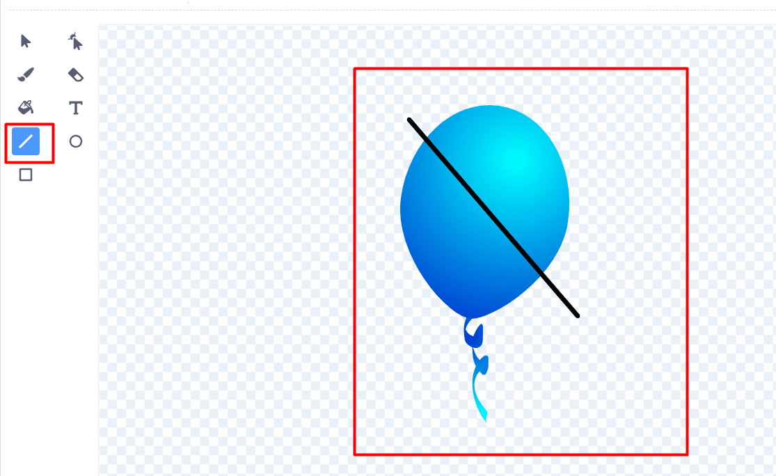 - Let us draw the cross lines on top of the pop costume sprite. Select the ‘Line’ tool and draw the cross line on top of the balloon.