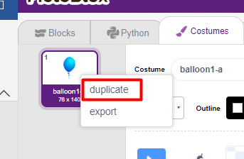 - Right click on the balloon1-a sprite and select the duplicate option, balloon1-a2 sprite will be formed.