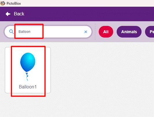 - Now, we have to add our sprite Balloon1 in the Rays Click on Choose a Sprite option and type Balloon in the search bar and select the Balloon1 sprite.