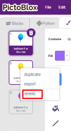 - Select the Costumes tab on the left side of the screen. Let us delete the balloon1-b sprites by right click on costume and select the delete Similarly, delete the balloon1-c sprite.