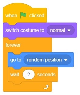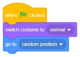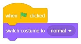 - Let us fix the costume normal by using the switch costume to (normal) block from the Looks palette.