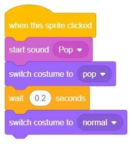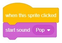 - Let us pop the Balloon1 sprite when the sprite is clicked by adding when this sprite clicked block from the Events palette. Once it is clicked it produce sound. Le us add start sound (pop) block from the Sound palette and also the costume of the Balloon1 sprite will change to pop. Let us add the switch costume to (pop) block from the Looks Change the costume to pop by clicking on the inverted triangle.