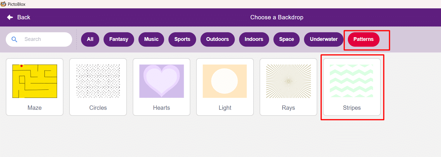 3. We will now, click on the Choose a backdrop option and select the patterns option and select the backdrop Stripes as shown.