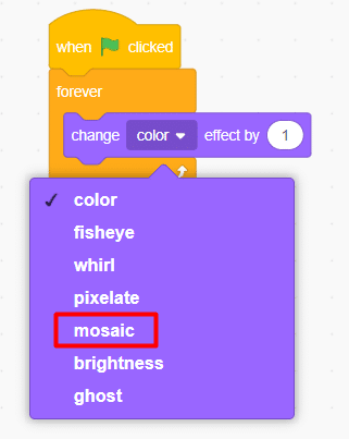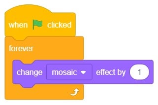 10. Click on the Tobi2 sprite on the sprite panel and change (color) effect by () to the mosaic effect by clicking on the inverted triangle and also change the value from ‘25’ to ‘1’as shown below.