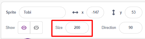 4. We already have our Tobi sprite in the stage. So, let us increase the size of the ‘Tobi’ by changing its size in the sprite panel to 200 as show below.