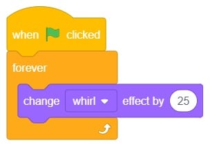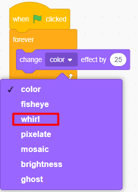 11. Click on the Tobi3 sprite on the sprite panel and change (Color) effect by () to the whirl effect by clicking on the ‘inverted triangle’ and change the value from ‘25’ to ‘1’as shown.